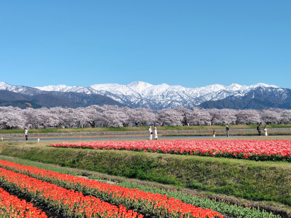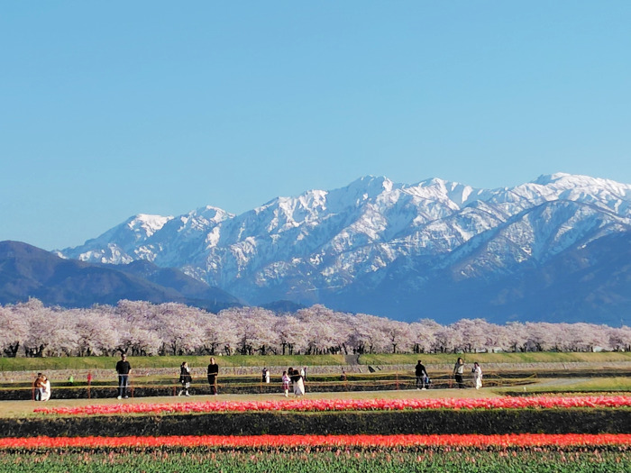 チューリップ、菜の花、桜、北アルプスの四重奏全部はそろいませんでしたが